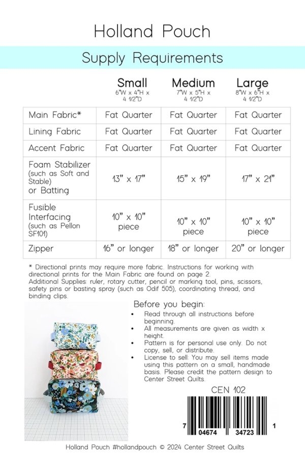 The Holland Pouch by Center Street Quilts is a quilted boxy pouch. This is a great class to take if you are wanting to learn to make bags. Afraid of putting in a zipper? This is the perfect time to practice. The bag is simple and fast: something that even a beginner could feel confident making. No bias binding, finished edges inside, and only straight line sewing (no curved seams). The bags come in 3 sizes. The Holland Pouch pattern has three size options, each of which only uses three fat quarters of fabric. We will be making the large bag which measures 8" w X 6" h X 4 1/2" D.